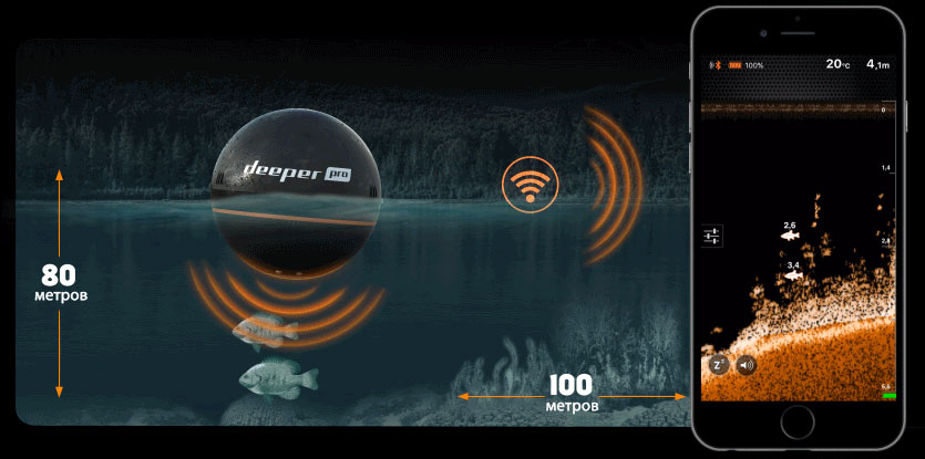 Deeper PRO використовує Wi-Fi з'єднання для передачі інформації на ваш смартфон або планшет. Wi-Fi забезпечує дальність з'єднання між ехолотом і смартфоном до 100 метрів. Вам не потрібен доступ до інтернету через 3G або Wi-Fi на місці риболовлі! Ехолот Deeper має вбудований Wi-Fi передавач, до якого підключається ваш смартфон або планшет. Все, що вам потрібно зробити - це включити Wi-Fi на смартфоні та підключити його до точки доступу Deeper.