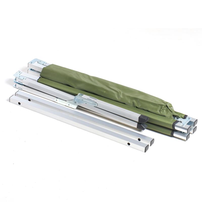 Розкладається ліжко просто, алюмінієва рама робить розкладачку міцної, що витримує велику вагу. Унікальна конструкція рами дозволяє збільшувати натяг тканини при збільшенні навантаження.