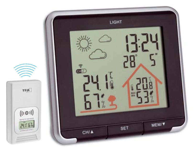 Температура та вологість зовнішнього повітря визначається власним бездротовим передавачем на місці. Ви також бачите температуру та вологість у приміщенні та завжди можете підтримувати клімат у межах комфортної зони за допомогою цільового опалення та вентиляції. Це створює приємне і здорове місце існування і навіть економить витрати на опалення. Максимальні та мінімальні значення відображаються під час натискання кнопки. Метеостанція має годинник з датою, а також зручне сенсорне керування. Дисплей з підсвічуванням.