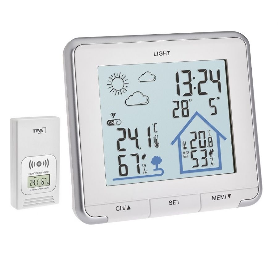 Температура та вологість зовнішнього повітря визначається власним бездротовим передавачем на місці. Ви також бачите температуру та вологість у приміщенні та завжди можете підтримувати клімат у межах комфортної зони за допомогою цільового опалення та вентиляції. Це створює приємне і здорове місце існування і навіть економить витрати на опалення. Максимальні та мінімальні значення відображаються під час натискання кнопки. Метеостанція має годинник з датою, а також зручне сенсорне керування. Дисплей з підсвічуванням.