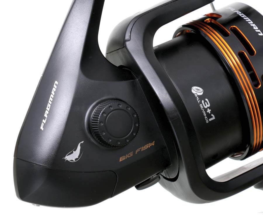 Flagman Big Fish - велика та дуже потужна спінінгова котушка, призначена для лову великої риби. Збільшена алюмінієва шпуля великої ємності, силовий механізм на трьох високоякісних шарикопідшипниках здатний впоратися з натиском будь-яких підводних гігантів. Виключно якісне укладання жилки досягається використанням вдосконаленого кулісного механізму. Точена алюмінієва шпуля і ролик жилковкладача з надтвердим напиленням дозволяють без обмежень працювати як з жилками, так і зі шнурами. Товста вісь з якісної сталі здатна витримувати значні навантаження, дозволяючи в разі необхідності затягнути фрикціон і форсувати виваження риби. Фрикційне гальмо з потужними дисками відрізняється стабільною роботою і не розчарує у відповідальний момент.