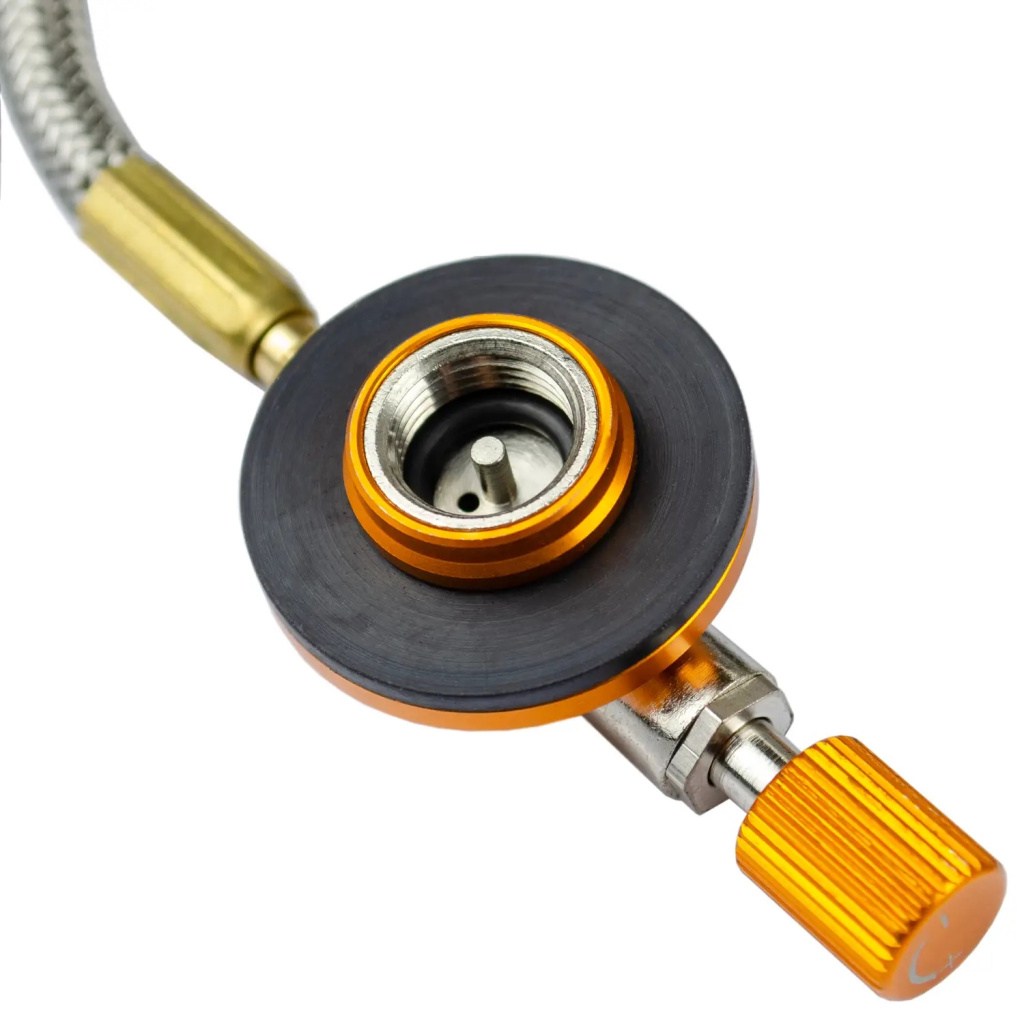 Довгий гнучкий шланг, що дозволяє, за необхідності, безпечно використовувати перевернутий газовий картридж, для більш повного використання.