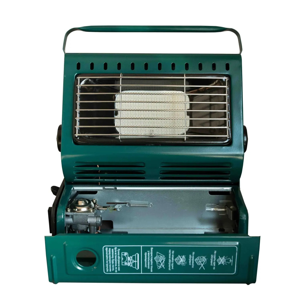 Обігрівач забезпечений клапаном контролю тиску газу і пристроєм налаштування захисту картриджа, а також зручною ручкою у верхній частині корпусу для перенесення.
