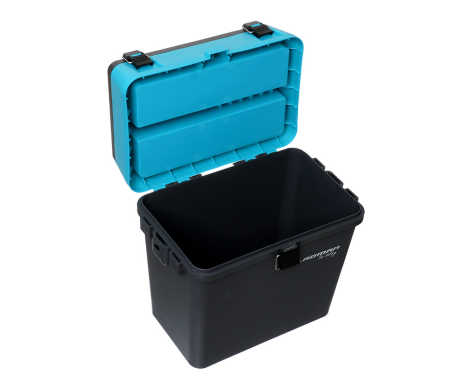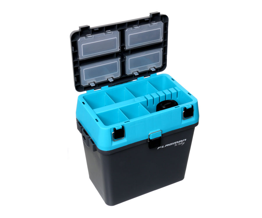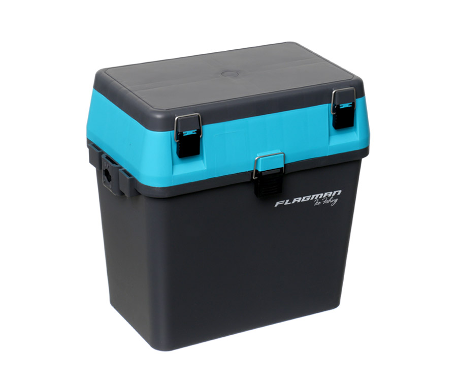 Риболовецький ящик Flagman, призначений для ловлі з льоду. Виготовлений з пружного удароміцного пластику, що не втрачає своїх властивостей при низьких температурах. Згладжені кути забезпечують травмобезпечність на риболовлі. Ящик має два відділення. Нижнє, основне, служить для зберігання улову, термоса з чаєм і т. д. Менше верхнє відділення, що закривається окремою кришкою і має знімні перегородки, призначене для вудлищ і приманок. Кришка обладнана чотирма вбудованими секціями, що закриваються окремими кришками. Для перенесення ящика служить регульований плечовий ремінь. Розміри, см : 37х35х22, 5(ДхШхГ)