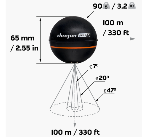 Deeper PRO+ 2 із високою точністю сканує на глибину до 100 м (330 футів). Підключається до вашого мобільного пристрою через свій Wi-Fi-модуль (мобільний зв'язок не потрібен) та зберігає стабільне підключення з дальністю закидання до 100 м/330 футів.