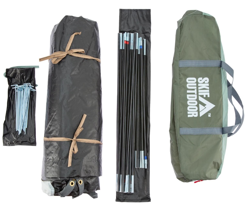 Комплектація: сумка (1), палатка (1), тент (1), дуга (2), дуга для тента (1), сталеві кілочки (19), стропи (5), чохол для дуг (1), чохол для кілочків(1), інструкція (1).