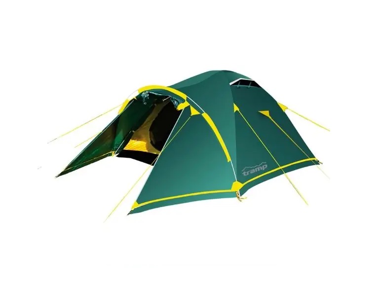 Універсальний намет Tramp Stalker 4 (V2). Тридугова модель конструкції "напівсфера" з просторим тамбуром, двома входами та снігозахистом по периметру зовнішнього тента.