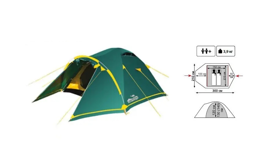 Універсальний намет Tramp Stalker 3 V2. Тридугова модель конструкції "напівсфера" з просторим тамбуром, двома входами та снігозахистом по периметру зовнішнього тента.