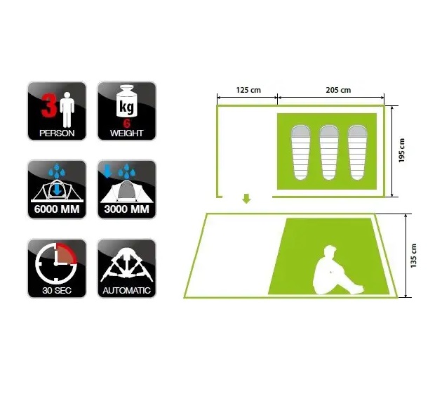 Розміри, ДхШхВ: (125 205)x195x135 см (зовнішній тент), 200х180х120 см (внутрішній намет)