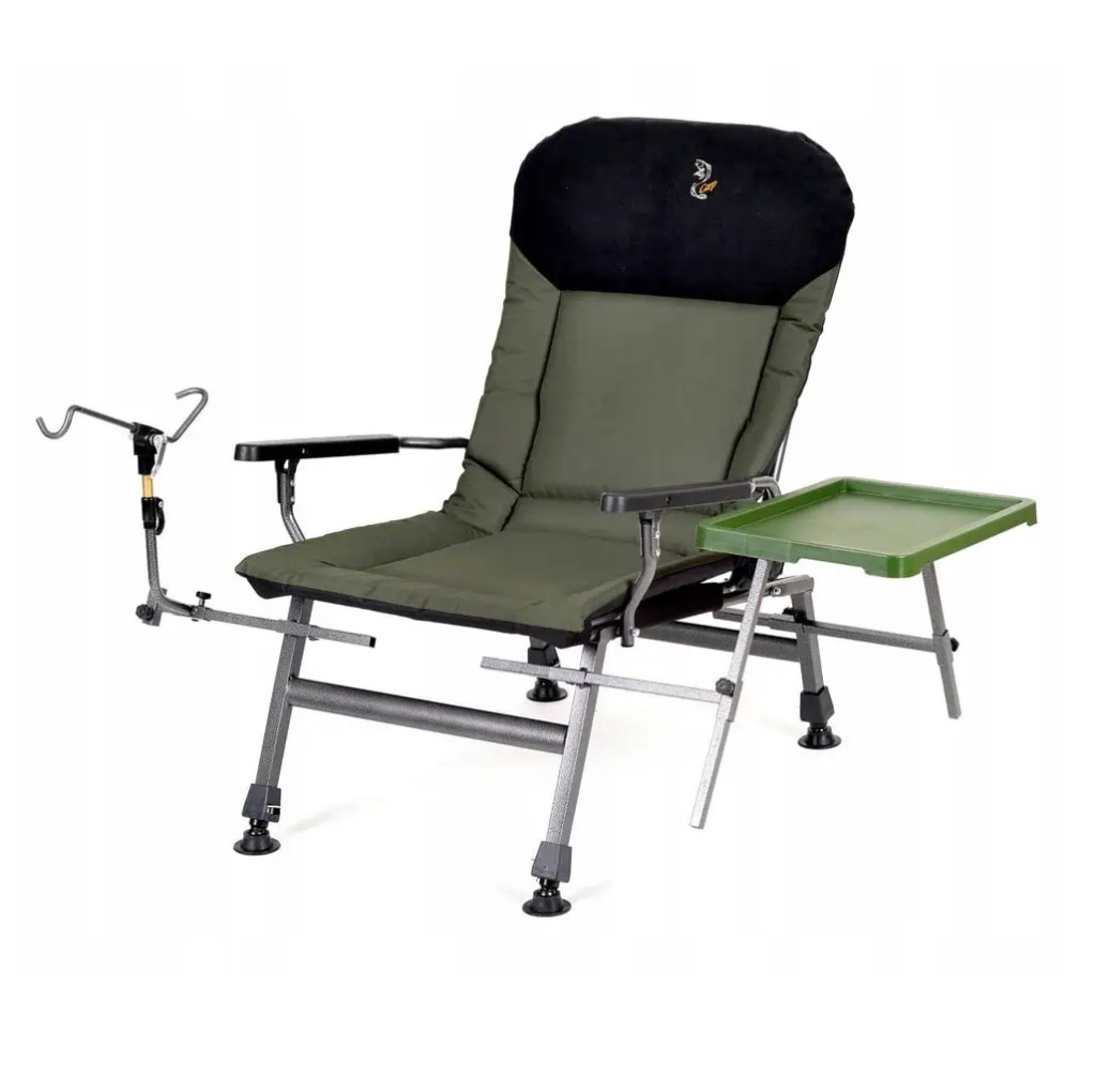 Карпове крісло для риболовлі обладнане регульованими ніжками та спинкою, має зручні підлокітники та м'який флісовий підголівник.