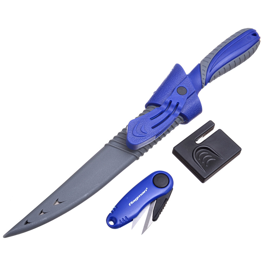 У рибальський набір входять ніж, точило для ножа та ножиці. Ніж: Філейний Flagman для обробки риби на філе. Руків՛я не ковзає в руці, має зручну рифлену поверхню. Лезо 18 см виготовлено з високоякісної нержавіючої сталі. Комплектується міцними пластиковими ножнами з кріпленням на пояс. Точилка: Зручна та компактна точилка для ножа допоможе тримати інструмент для обробки риби завжди гострим. Ножиці: Компактні складні ножиці з високоякісної нержавіючої сталі з пластиковими ручками тепер завжди будуть у вас під рукою в будь-якій ситуації.