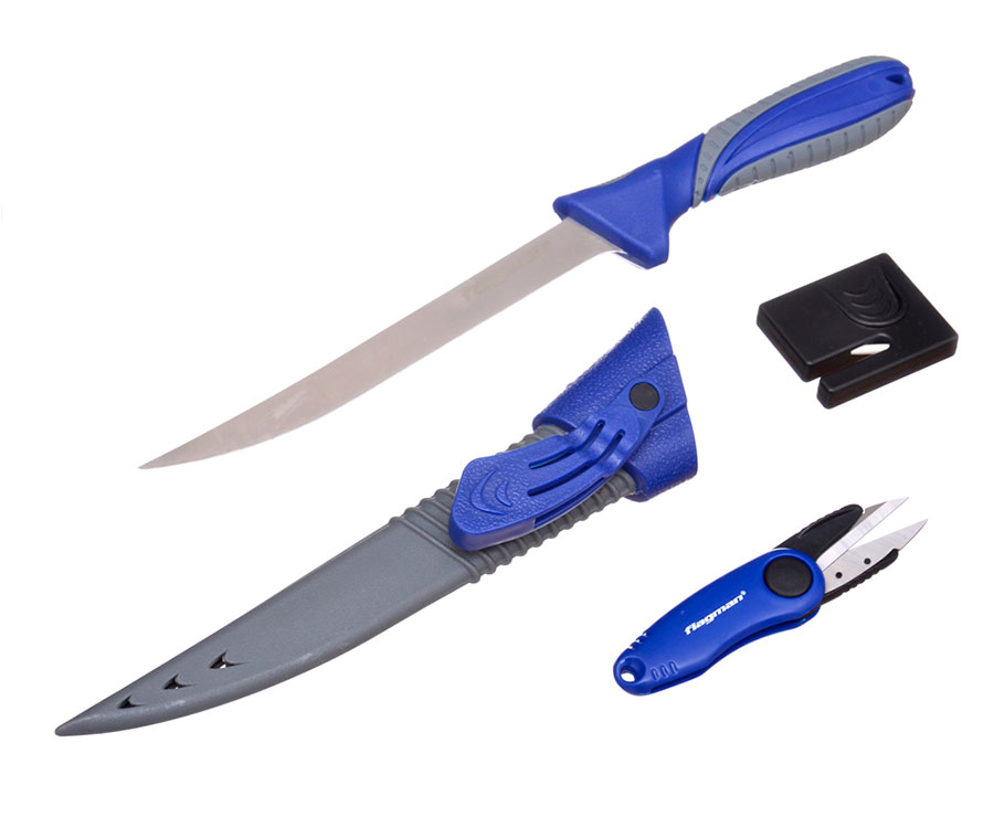 У рибальський набір входять ніж, точило для ножа та ножиці. Ніж: Філейний Flagman для обробки риби на філе. Руків՛я не ковзає в руці, має зручну рифлену поверхню. Лезо 18 см виготовлено з високоякісної нержавіючої сталі. Комплектується міцними пластиковими ножнами з кріпленням на пояс. Точилка: Зручна та компактна точилка для ножа допоможе тримати інструмент для обробки риби завжди гострим. Ножиці: Компактні складні ножиці з високоякісної нержавіючої сталі з пластиковими ручками тепер завжди будуть у вас під рукою в будь-якій ситуації.