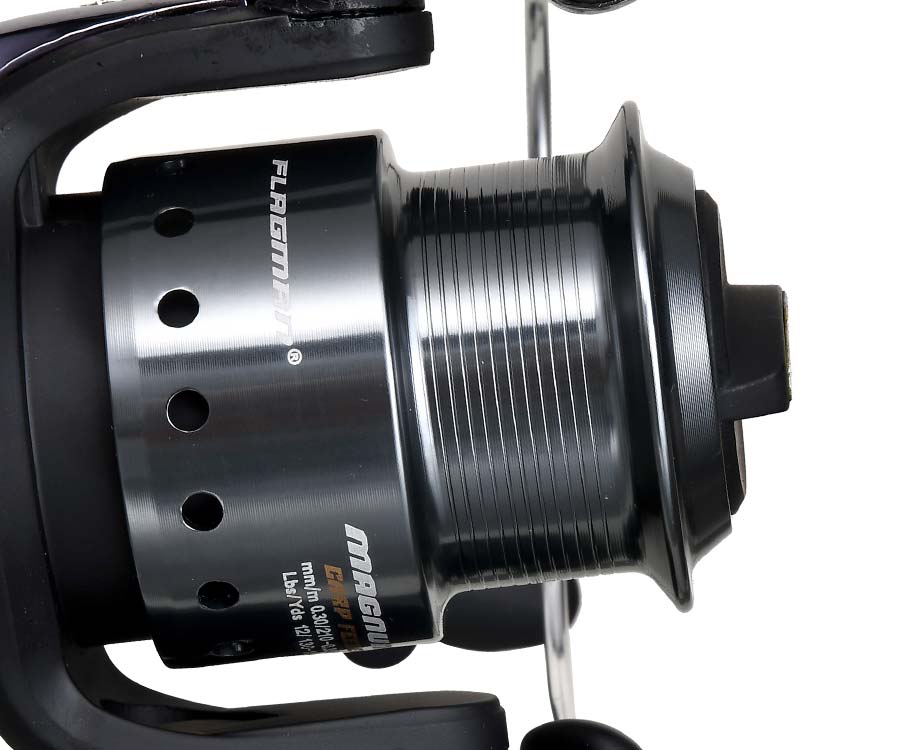 Flagman Magnum CARP Feeder – доступна котушка, яка підійде як для фідерної, так і для класичної коропової ловлі. Велика алюмінієва шпуля з конічним переднім буртиком має велику площу намотування та дає змогу виконувати далекі закидання. Система Free Spool, якою найчастіше оснащуються спеціалізовані коропові котушки, стане в нагоді й під час фідерної ловлі: клювання коропа не часті, але дуже потужні, тому можливість відійти від снасті, не побоюючись, що вона через секунду полетить у водойму, не варто недооцінювати. Котушка Flagman Magnum CARP Feeder має пластиковий корпус та механізм, який зібрано на трьох кулькових підшипниках.