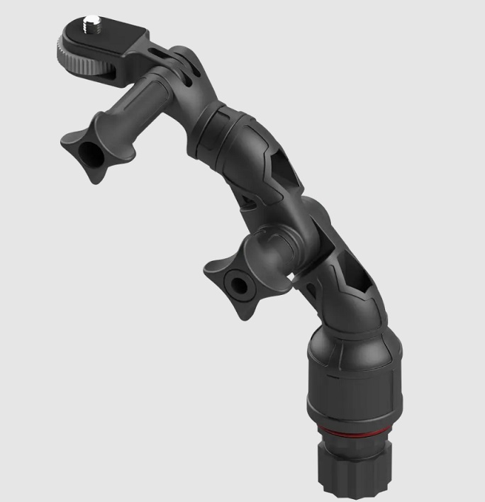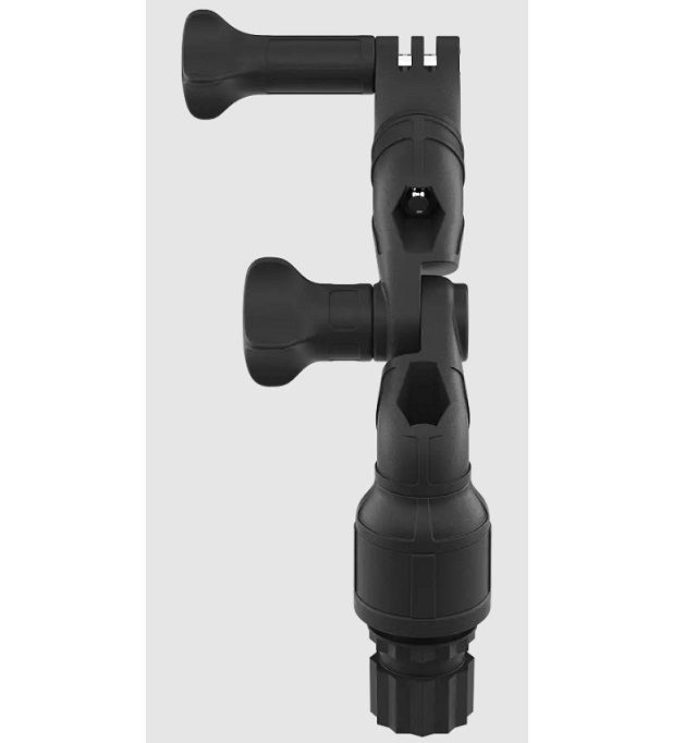 Призначений для кріплення екшн-камери на плавзасобі і налаштування її положення. Конструкція складається з кронштейна з різьбовим з’єднанням 1/4", вилкового роз’єму 2/3 GoPro, нахильного з’єднання зі шліцами 15° і адаптера з зовнішніми шліцами 30°. Передбачена можливість повороту закріпленого обладнання відносно тримача, а також повороту всієї конструкції на 360° відносно адаптера. Для фіксації положення нахилу використовуються дві чотиригранні ручки-гайки. До збірки входить кріплення: гвинт M6*60 DIN 912, болт M6*25 DIN 931, гвинт M6*25 DIN 963, болт M5*30 DIN 931, гайки M6 DIN 985, M6 DIN 934 і M5 DIN 934. Пластикові деталі виготовлені з армованого скловолокном поліаміду, кріплення - з нержавіючої сталі марки А2.