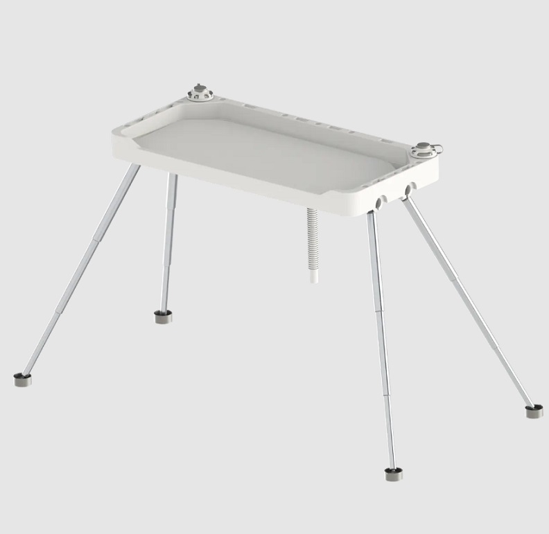 Призначений для розширення робочого простору на моторних човнах чи катерах або для використання в якості столу на березі. Конструкція складається з 4-х секцій, з’єднаних шайбами, гвинтами M6*25 DIN 912 і гайками M6 DIN 985. До комплектації - 6 замків Fs219, 4 з яких прикріплено під поверхнею за допомогою 16 саморізів 6, 3*25 DIN 920 таким чином, щоб у них можна було фіксувати адаптери у формі 12-кутної зірки, що додаються до збірки. Два інших замка прикріплено до робочої поверхні 8-ма гвинтами М6*20 DIN 912 та гайками M6 DIN 985. Робоча поверхня - 1000 х 350 мм, уздовж периметра передбачено місця для підвішування інструментів. На 2-х середніх секціях - отвори для зливу, оснащені гофрованим шлангом, L - 1000 мм. Стіл укомплектовано телескопічними ніжками L - 800 мм. Секції виготовлені з ABS-пластику, основні деталі - з поліаміду, армованого скловолокном. Ніжки - з алюмінієвого сплаву, вкритого анодним шаром. Кріплення - з нержавіючої сталі марки А2.