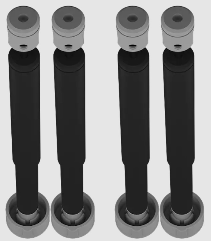 Комплект призначений для використання модульного столу моделі Tm450 на твердих поверхнях (наприклад, березі водойми). До комплекту входять 4 телескопічні ніжки, що кріпляться у спеціально передбачених місцях під поверхнею столу. Конструкція кожної складається з двох труб (Ø 24, 8 мм, L - 128 мм та Ø 20, 4 мм, L - 117 мм), поршня, ексцентрика, упору, заглушки з кулею на кінці, що фіксується в опорі, створюючи кульове з’єднання, відкидного болта, штифта та гайки М6 DIN 934. Труби виготовлені з алюмінієвого сплаву та вкриті анодним шаром. Деталі - з армованого скловолокном поліаміду. Кріплення - з нержавіючої сталі марки А2.