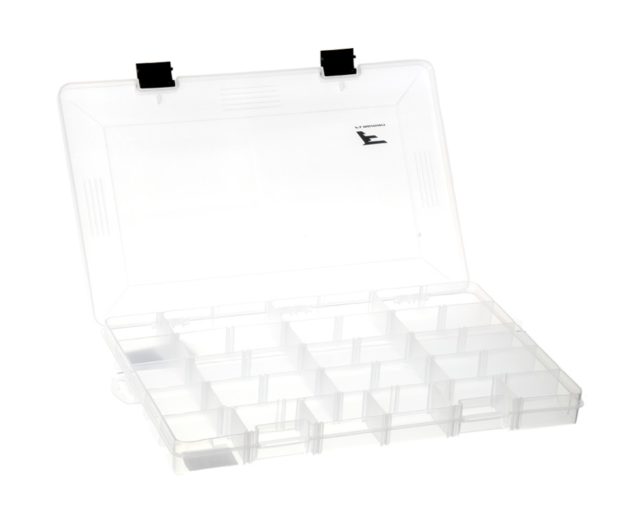 Flagman Tackle Box #16 – містка одностороння коробка, яку виготовлено з прозорого ударостійкого пластику. Завдяки системі знімних перегородок відмінно підійде для зберігання і транспортування приманок різноманітних типів і розмірів, а також джиг-головок, елементів оснастки та інших аксесуарів. Кришка рибальської коробки Flagman Tackle Box #16 закривається на дві міцні надійні защібки. Розміри: 37,5x22,5x3,5см.