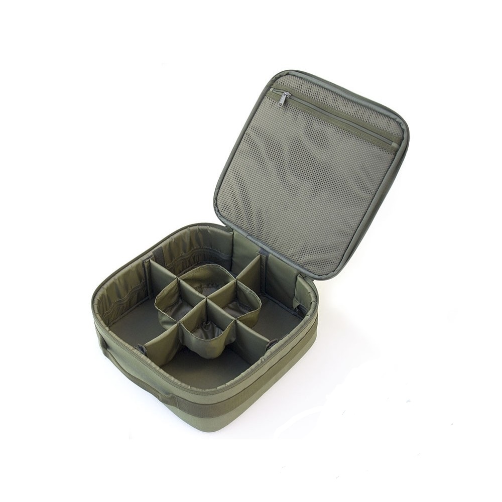 Жорстий чохол призначений для зберігання і транспортування 4-х котушок з розміром шпулі 5000-8000 і 4х запасних шпуль до них. Контакту між котушками запобігають знімні перегородки. На перегородки пришиті кармани для шпуль, які можна за потреби скласти. Під кришкою є сіткова кишеня на блискавці для дрібниць. Для перенесення в руці є зручна ручка. Виготовлений з непромокаючої тканини з ПВХ просоченням і якісної фурнітури. Для захисту котушок від пошкоджень всередині бокових стінок встановлена піна 5мм і пластик 2мм, які надають жорсткість всьому чохлу. В кришці і дні також вшита піна 8мм. Внутрішні розміри: 32х32х11см. Гарантія 1 рік.
