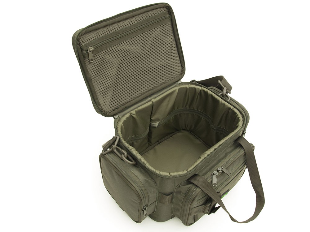 Сумка призначена як для ходової спінінгової риболовлі, так і для риболовлі з лодки. Жорсткість сумці надає вшита в стінки щільна піна 8мм, а також спеціальні пластикові ребра жорсткості в кутах. Основне відділення однооб’ємне, внутрішній розмір 28х20х20см. Кришка сумки може бути використана в якості столика, по периметру якого вшитий борт, який запобігає скачуванню грузів, приманок. Також зверху кришки є резинка, під яку можна фіксувати одежу, рукавиці і т.п. Резинка за необхідності може бути знята. З внутрішньої частини сумки на кришці є сіткова кишеня на блискавці. Дно сумки виготовлено з ПВХ тканини (лодочної), на ньому пришиті антислизькі ніжки. Ззовні сумки є три кармани. Центральний розміром 22х14х4см. Його відкриття обмежено боковими перетинками, які також запобігають випаданню речей з кармана. Всередині є сітковий карман на блискавці. Зовні розташований ще один карман на блискавці, петля для кріплення інструменту та кріплення для екстрактора. По боках сумки розташовані кармани на блискавці 15х15х4см. В передній частині сумки в кутах розташовані кріплення для тримача РС6 чи РС7 (не постачається в комплекті). Для перенесення у сумки є ручки на знімний ремінь з наплічником. Гарантія 1 рік.
