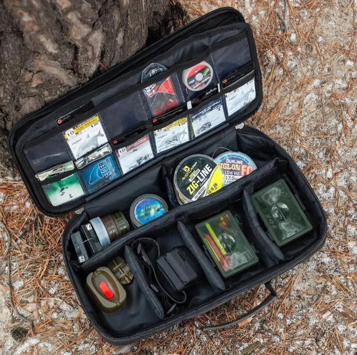 Подвійний органайзер Fisher (К-005). Основне відділення сумки розділене знімними перегородками на липучках, що дає змогу розділяти простір на свій розсуд. У кришці сумки є прозорі кишені на блискавці. У перегородці розміщено 12 прозорих кишень з одного боку та 12 кишень зі зворотного боку, у сумі 24 кишені для гачків. Завдяки такій сумці все необхідне для в'язання повідців тепер є в одному місці — інструменти, бабини з волосінню, гачки, повідниця.... Розмір: Довжина — 41 см, ширина — 21 см, висота — 7 см.