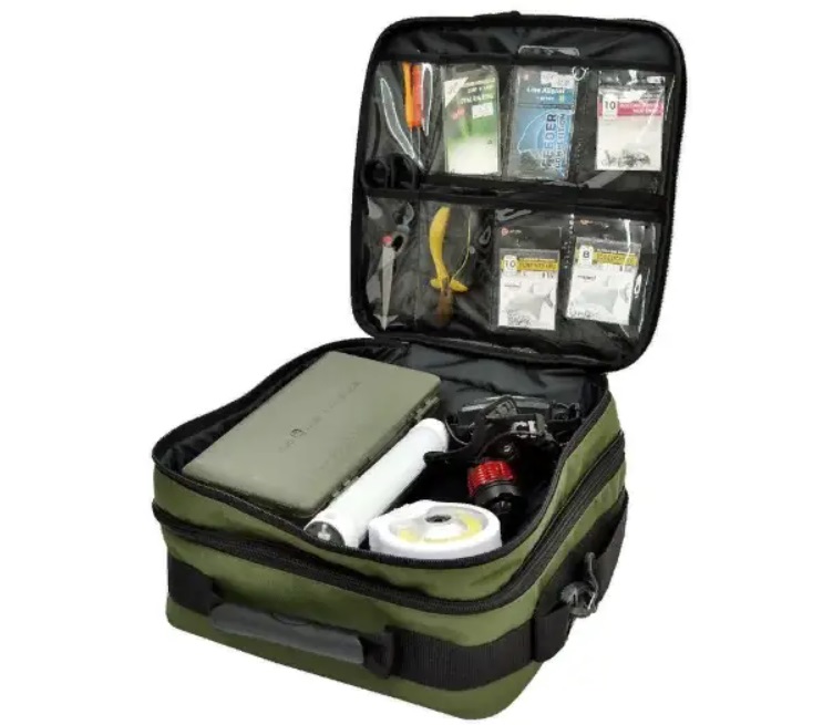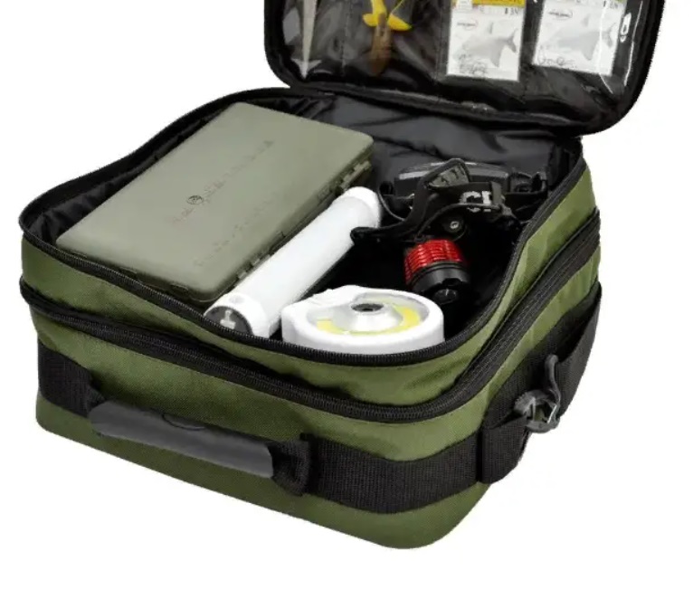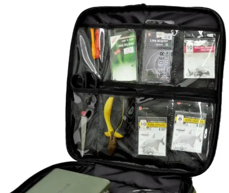Сумка для снастей (подвійна) - складається з 2 відділення Верхнє відділення має розмір: ширина 32 см, довжина 32 см, висота 5 см в нього можна скласти ліхтарики, невеликі коробки або різні рибальські аксесуари Верхньої частини кришки розташовано 8 прозорих кишень сюди можна розмістити дрібні аксесуари (гачки,игли, підніжки, лідкори та інші) Нижнє відділення має розмір: ширина 32 см, довжина 32 см, висота 12 см — це відділення обладнане знімними перегородками на липучках, що дає змогу розділити робочий простір або створити один великий відсік. У цю частину може поміститися маркерний поплавець, волосіні , закормову ракету тощо. У верхній частині другого відділення також є сітчаста кишеня на змійці. На зовнішній стороні сумки є невелика кишеня. Сумка має плечовий ремінь із прогумованою накладкою і зручну гумову ергономічну ручку для перенесення також змійки з двома бігунками. Матеріал: Міцна сумкова рюкзачна тканина Оксфорд. Габарити: ширина 32 см, довжина 32 см, висота 17 см.