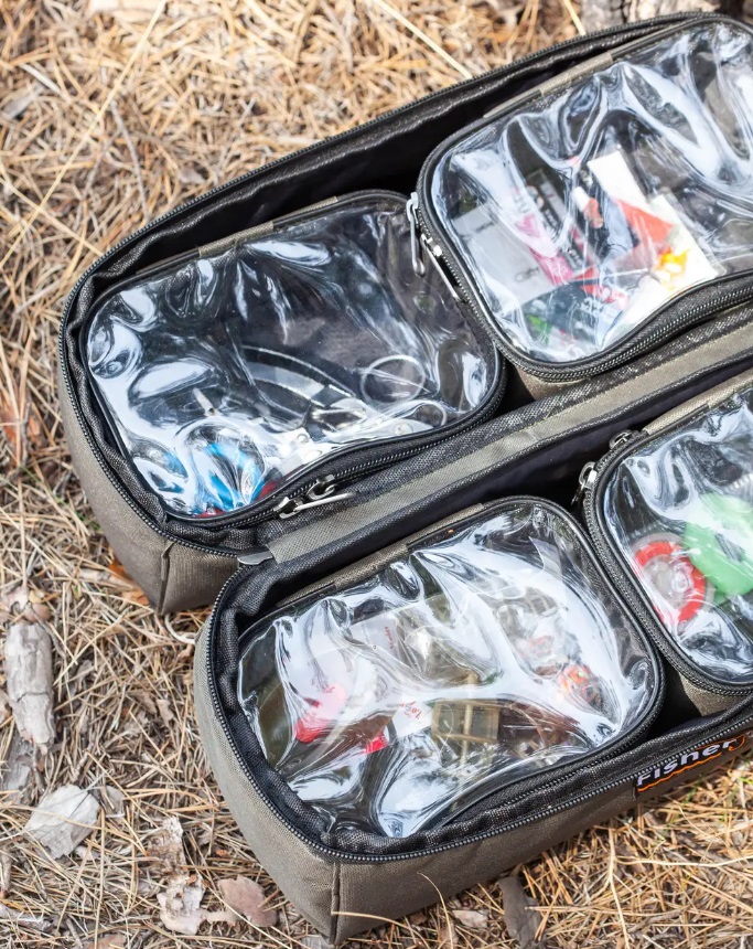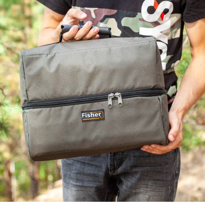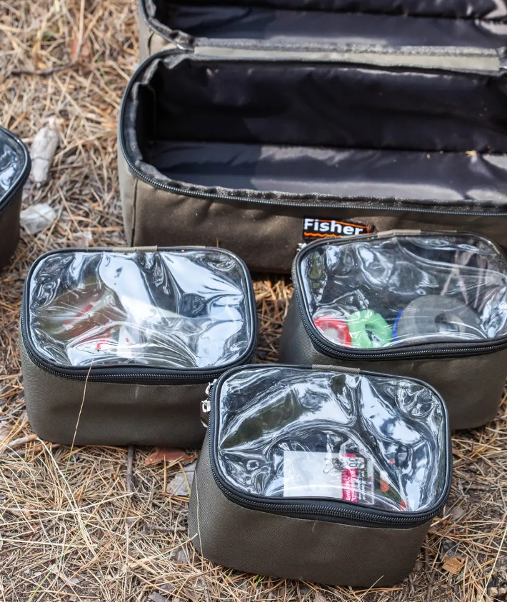 Сумка для рибальського приладдя від компанії Fisher Місткість і практичність цієї моделі зашкалює Основне відділення вміщує 4 порівняно невеликих органайзери з прозорими кришками на блискавці, завдяки яким більше не потрібно відкривати кожну сумочку, тепер вміст як на долоні У сумочки можна скласти всі необхідні для риболовлі предмети гачки, підніжки,фонарики, лески, бешнури, готові оснастки, повідці, візоленту, веги, завантажила.. Основна сумка має ручку для перенесення Розмір основної сумки: Висота 28 см, довжина 36 см, ширина 14 см Розмір маленьких сумок: Висота 11 см, ширина 12 см, довжина 19 см Тканина Оксфорд Д 600 з пВх покриттям невибаглива в догляді та досить щільна.Підкладка поліестер 75, ущільнювач пропілен