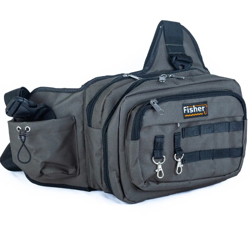 Сумка спінінгіста від компанії Fisher призначена для риболовлі з берега Маючи досить великий об'єм, вона здатна вмістити все, що потрібно — від приманок та інструментів до пляшки з водою в спеціальній зовнішній кишені. Сумка має 4 кишені. Розмір двох центральних кишень: Довжина — 29 см, висота 21 см, глибина 7 см. Розмір накладної кишені: Довжина — 24 см, висота — 17 см, глубина 4,5 см. Сумка спінінгіста Fisher (К-078). Передня кришка легко перетворюється на монтажний міні-клац, завдяки пластиковій вставці. Сумка виготовлена з водонепроникного матеріалу Д-600. Модель кріпиться на широкому зручному поясі та на плечовому ремені, завдяки яким легко переміщається за спину безпосередньо перед процесом лову.