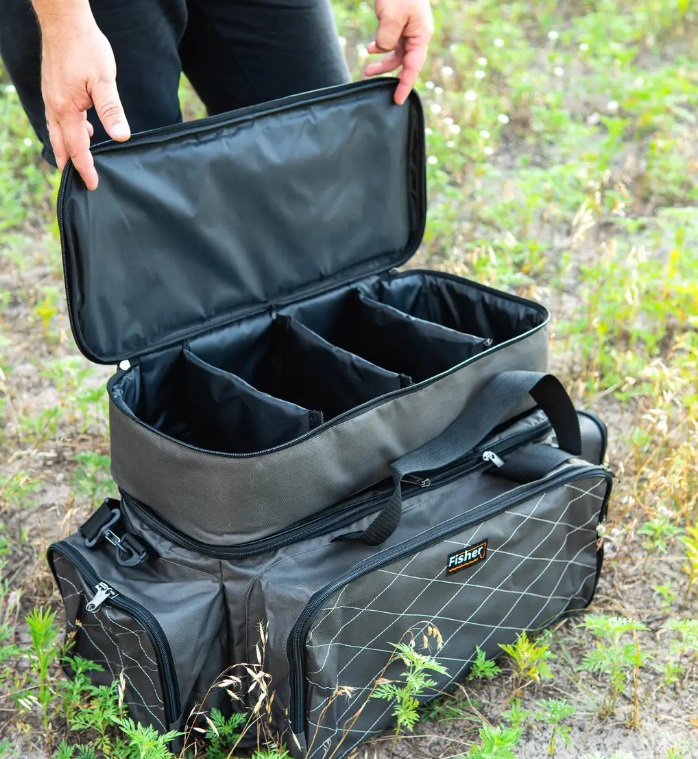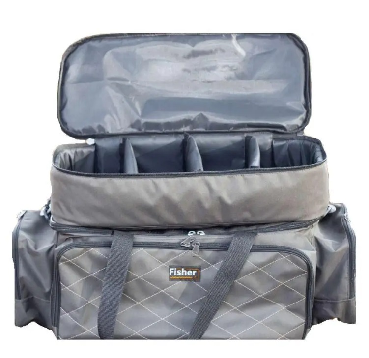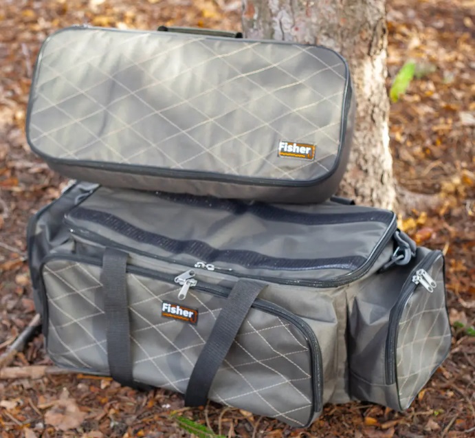 Сумка для риболовлі Fisher (К-086). Містка та функціональна сумка для риболовлі + чохол для 4 котушок від компанії Fisher. Зверху сумки є чохол для 4 котушок, який кріпиться на липучках, за потреби його можна зняти та використовувати окремо. Просторе основне відділення. 3 глибокі зовнішні кишені. Плечовий ремінь із гумовою накладкою. Ручки для перенесення в руках. Зносостійка рюкзачно-сумкова , міцна тканина — коксфорд до 600 із пВх покриттям. У стінках сумки вшитий ущільнювач 8 мм. Підкладка — 75 д. Розмір сумки для котушок: Довжина 50 см, ширина 22 см, висота 10 см. Розмір сумки без кишень: Довжина 52 см, ширина 23 см, висота 24 см. Передний кишеня: 21 45 см, глубина 9 см. Бічні кишені: 20 19 см, глубина 9 см.