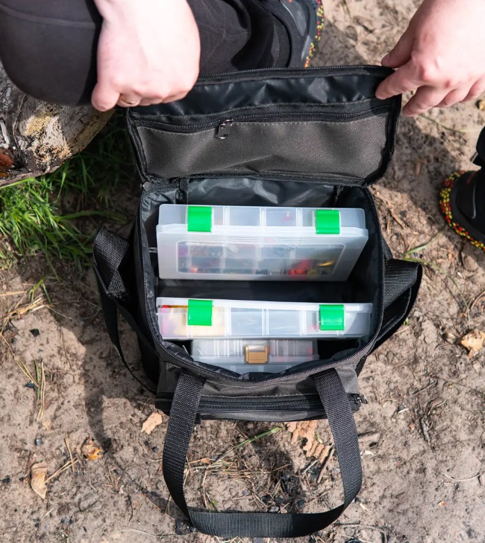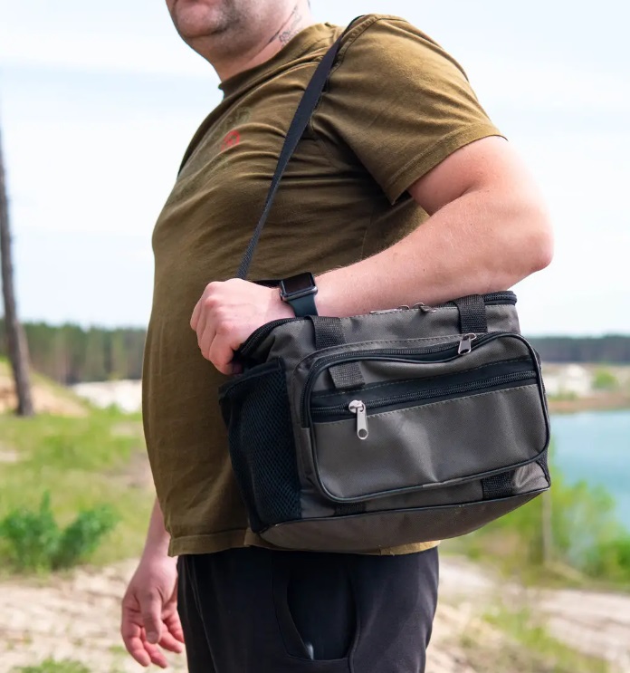 Сумка для риболовлі Fisher (К-096). Сумка для риболовлі від компанії — Fisher, сумка має одне основне відділення, дві сітчасті кишені з боків, дві кишені на блискавці спереду й одна кишеня зверху кришки також на блискавці. Сумка обладнана плечовим ременем із прогумованою накладкою та подвійними ручками для перенесення в руках Тканина міцна - оксфорд із пвх-покриттям водовідштовхувальна, легка чиститься й миється.В стінках сумки вшитий ущільнювач 8 мм, який дає змогу тримати форму виробу У цю модель може поміститися 4 коробки відповідного розміру або ж рибальське приладдя, як-от силіконові насадки, коробки з вантажами та різні спінінгові інструменти Сумка підходить для фідерної, поплавцевої, спінінгової риболовлі Розмір: Довжина 27 см, ширина 19 см, висота 21 см.