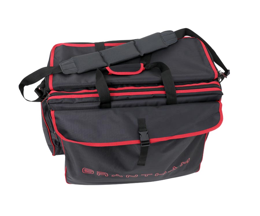 Flagman Grantham Carryall Bag - водонепроникна сумка великого розміру, здатна вмістити практично усі ваші рибальські приналежності! Її стінки виготовлені зі спеціальних напівжорстких панелей-вставок, які сприяють утриманню форми і захищають вміст від ушкоджень. Виготовлена з міцного довговічного матеріалу 1200D. Carryall Bag оснащена двома фронтальними і двома боковими кишенями. Одна з передніх кишень має водонепроникну вставку на липучках, призначену для транспортування рибальського садка. Для зручності миття і просушування вставка легко знімається. Решта кишень також досить місткі, закриваються на блискавки. Головне відділення настільки велике, що в ньому можна розмістити усе необхідне оснащення та аксесуари. Воно також закривається на блискавку. Посилений низ сумки виконаний з щільної і довговічною гуми. Grantham Carryall Bag має м'який плечовий ремінь і зручні ручки для перенесення. Розміри: 75x37x52 см.