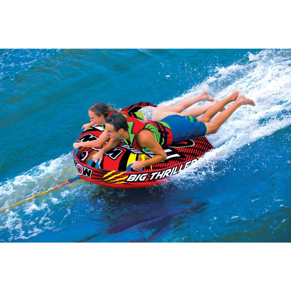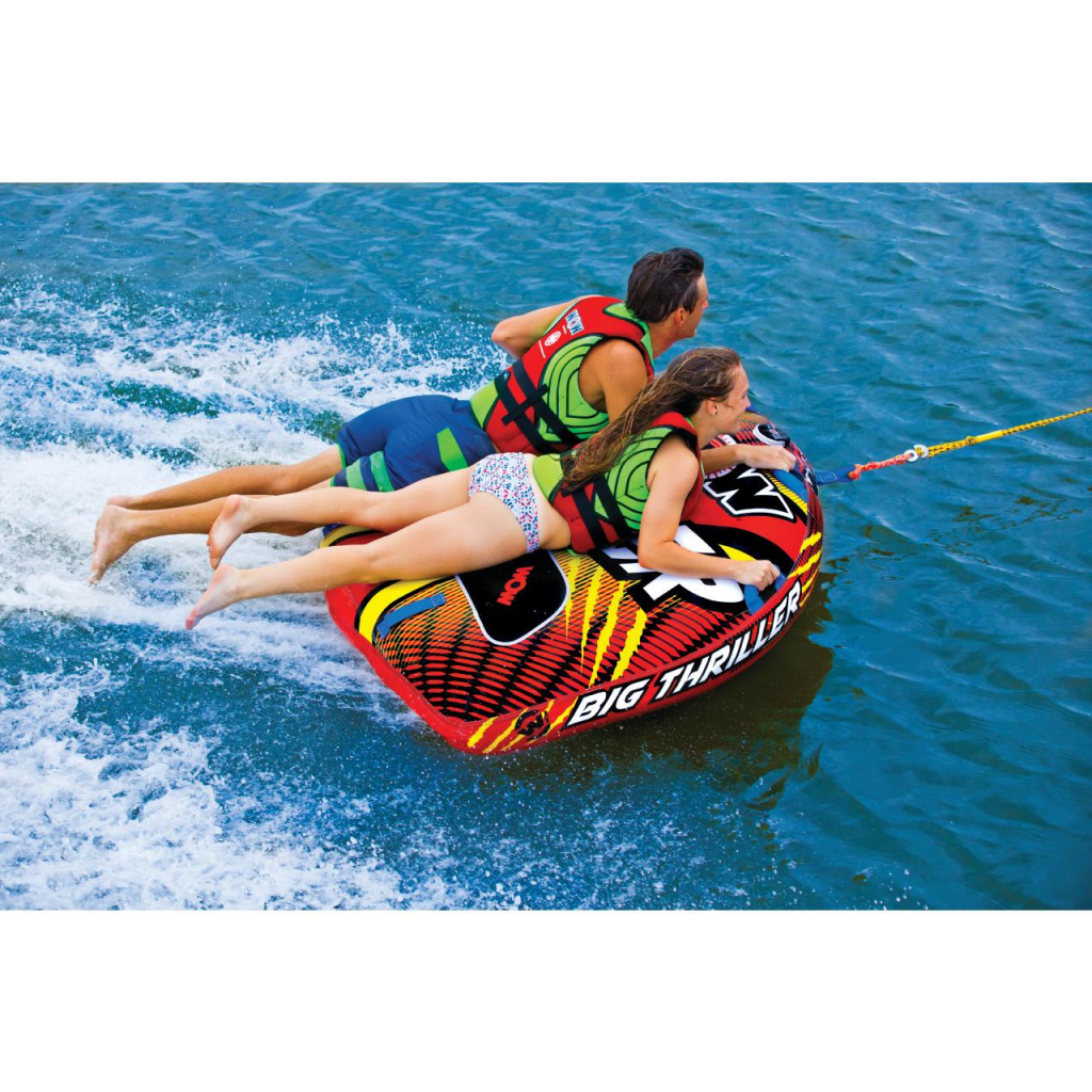 WOW Big Thriller 2Р виконана у графічному дизайні. Конічна конструкція вище попереду, ніж ззаду, для запобігання ефекту піднирування. Плюшка зроблена з міцного ПВХ балона та матеріалу EVA. Подвійні ручки виготовлені з піни із захисною сіткою. Швидкісний клапан для швидкого накачування та скачування, кришка клапана на блискавці. Розміри надутої плюшки 168 х 157 см.