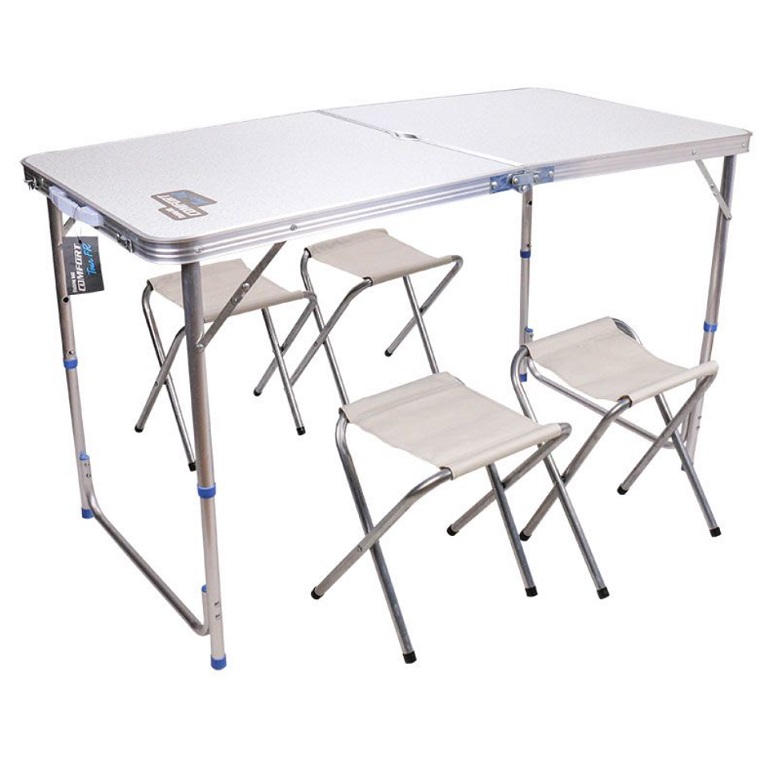 Стіл має ручки для переноски. А фіксатори, не дають самовільно розкриватися. Розкладається та складається стіл дуже просто. Приберіть фіксатори, розкрийте стіл як валізу, розкладіть ніжки, зафіксуйте їх, та закрийте стопорний гачок і стіл готовий. Розміри 60 на 120см. У складеному вигляді 60 на 60 см відповідно. Має невелику вагу завдяки каркасу з алюмінію. Стільниця із пластику з анти ковзким покриттям, має отвір для парасольки