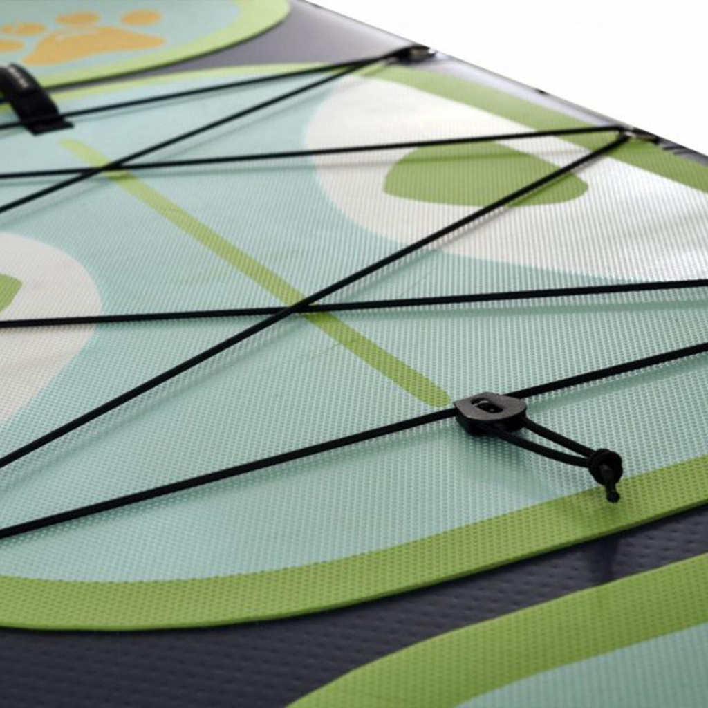 зручне транспортування у складеному вигляді, низька ціна, оригінальний дизайн, піднятий ніс полегшує прохідність хвилями, плавник підвищує курсову стійкість, протиковзке покриття EVA FOOTPAD дозволяє стійко стояти на дошці, система фіксації багажу BUGEE надійно утримує речі на носі дошки
