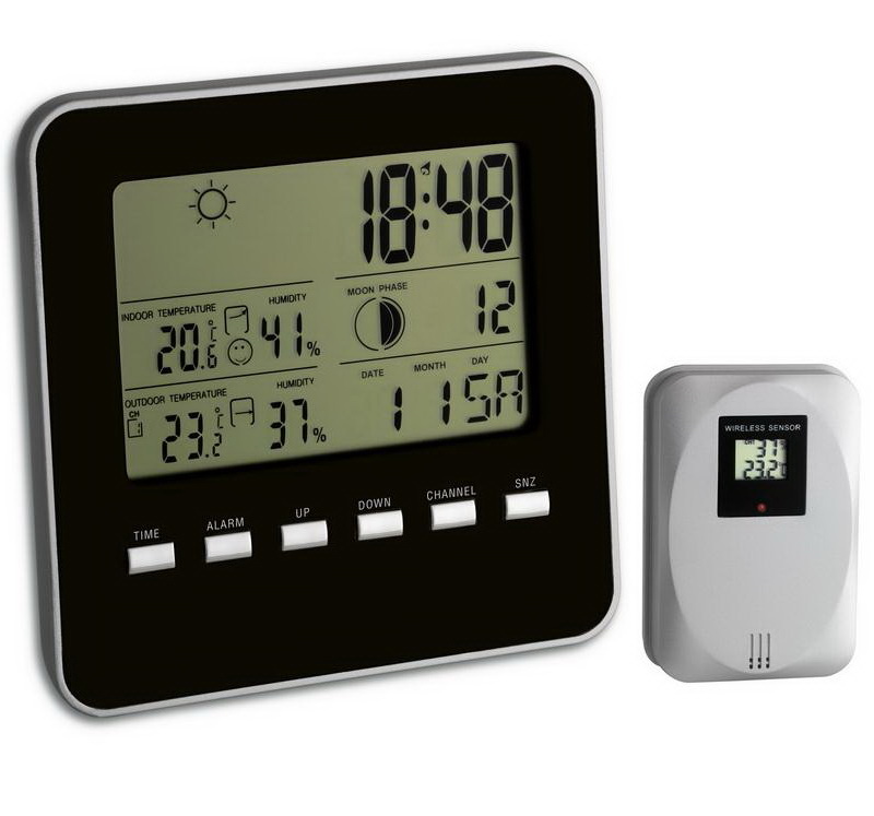 Зовнішня температура та вологість передаються від бездротового зовнішнього датчика на частоті 433 МГц, відстань передачі до 30 метрів (відкритий простір)