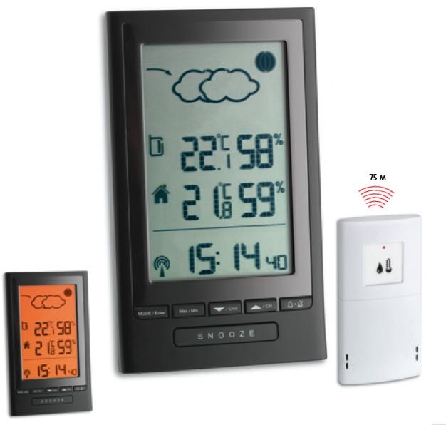 Температура та вологість зовнішнього повітря визначаються окремим бездротовим передавачем на місці. Сонце, хмари чи краплі дощу – вбудований електронний барометр вимірює тиск повітря і, ґрунтуючись на змінах атмосферного тиску, символ погоди дає прогноз на майбутню погоду.