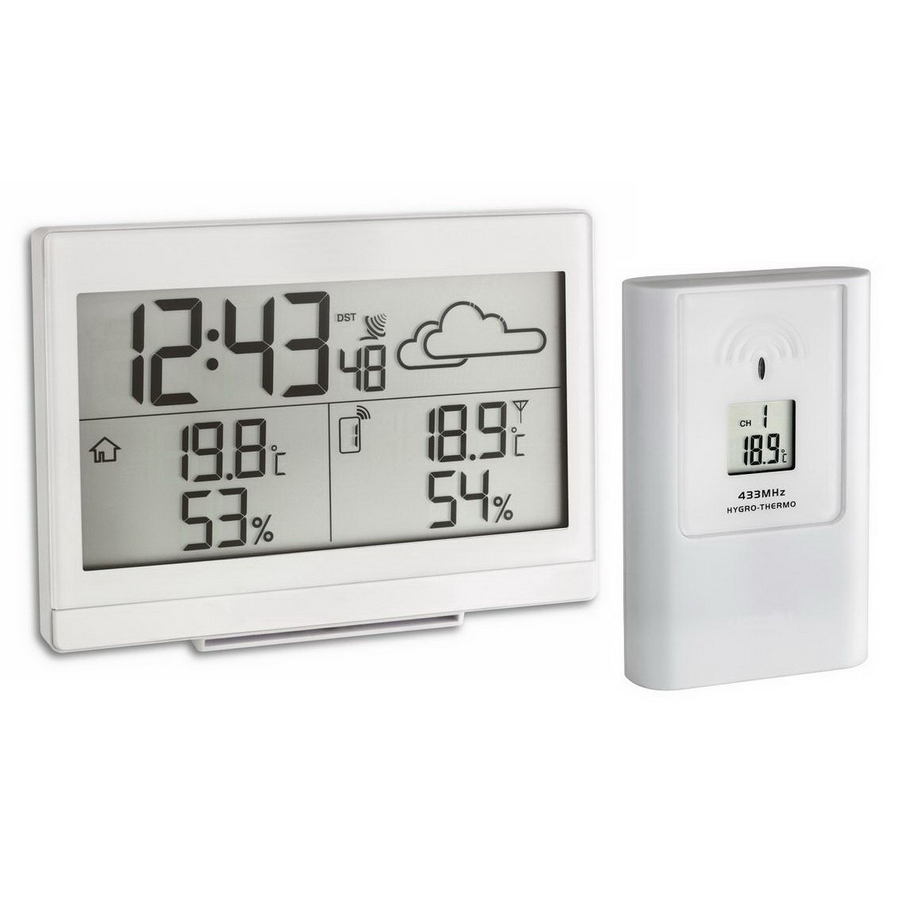 Зовнішня температура та вологість передаються від бездротового зовнішнього датчика на частоті 433 МГц, відстань передачі до 50 метрів (відкритий простір)