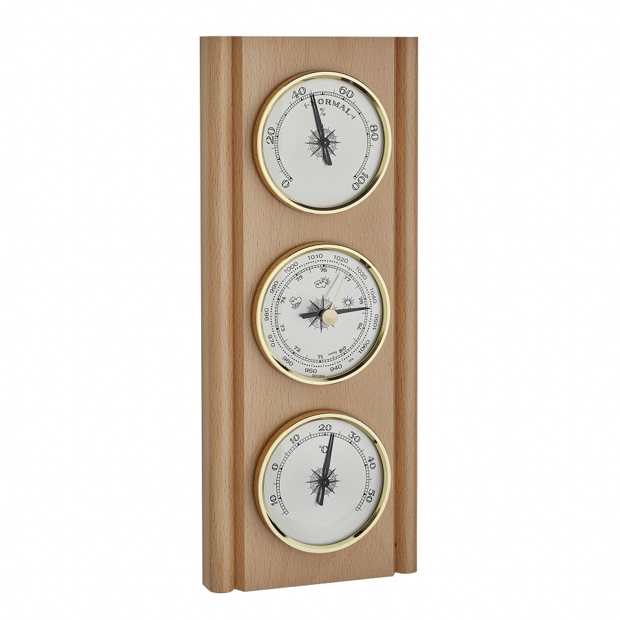Метеостанція в класичному стилі, виготовлена з дерева з декоративною канавкою, складається з барометра, термометра та гігрометра.