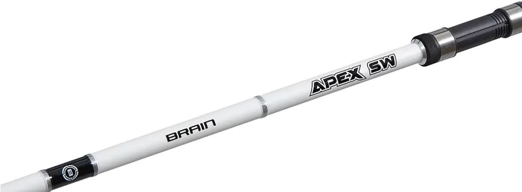 Вудилище серфове Brain Apex SW застосовується для берегового лову в солоній воді. Основна увага виробника була приділена далекобійності - здатності закидати оснастку на велику відстань. На відміну від класичних серфових вудилищ, Apex SW має максимально тонкий бланк, який дозволяє полегшити виконання наддалеких закидів важких монтажів. Таких характеристик вдалося досягти завдяки використанню карбонового матеріалу, скомпонованого з певною товщиною та конусністю. На вудилищі встановлені посилені протизаплутувальні кільця з полегшеними вставками, які не навантажують бланк і сприяють вільному вильоту волосіні. Завдяки інноваційній схемі їх розташування, волосінь легко злітає зі шпулі котушки, зустрічаючи мінімальний опір у кільцях. Надійний котушкотримач гвинтового типу гарантує надійну фіксацію котушки навіть за найбільших навантажень. Для забезпечення зручного та широкого хвату вудилища під час закидання, його ручка має збільшену довжину та оснащена рукояткою з EVA, яка не ковзає в руці.